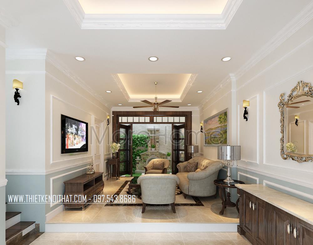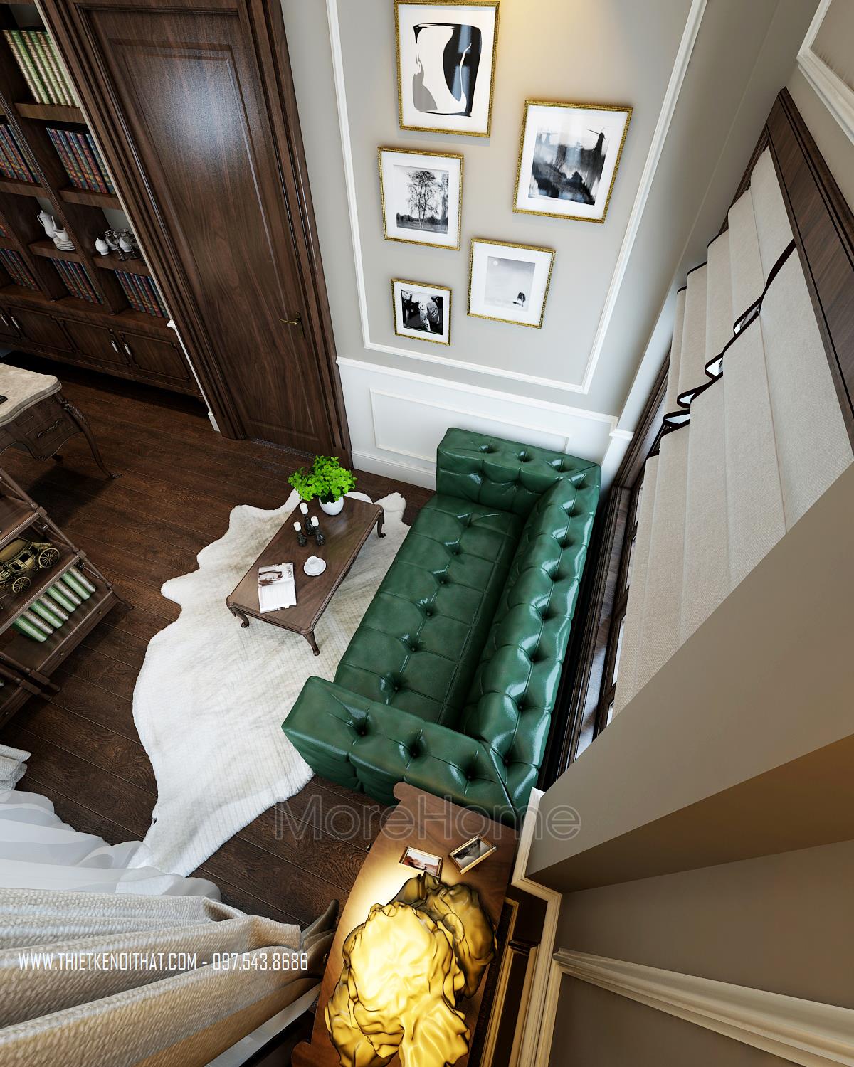 Thiết kế nội thất tân cổ điển tại phòng khách khá đơn giản. Nổi bật nhất ở không gian này chính là thiết kế ghế sofa to bành mang đến cảm giác an toàn và vững chãi cho căn nhà. Thay vì các thiết kế đơn giản, linh hoạt, không tốn diện tích thì thiết kế sofa này lại khá rộng rãi, phù hợp với các căn biệt thự cao cấp, các không gian chia cắt rõ ràng. Cửa ra vào được thiết kế cân bằng ở giữa, diện tích rộng mở và không có vật chắn giữa giúp mang lại ánh sáng tự nhiên và sự hứng khởi cho không gian.