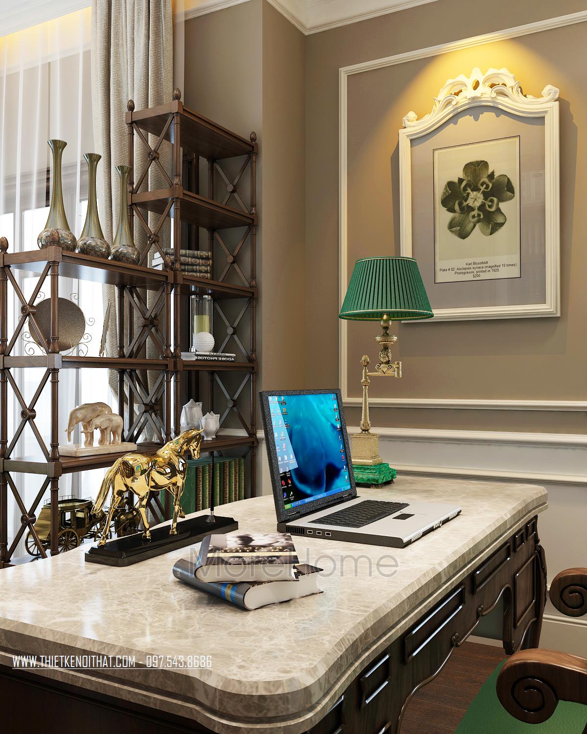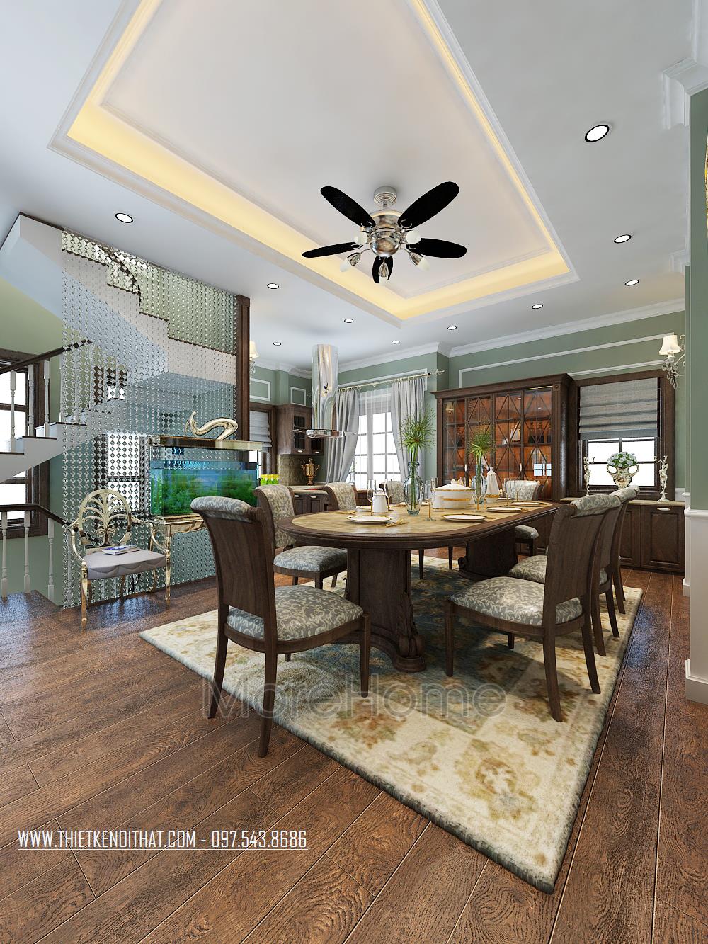 Tiếp đến là thiết kế nội thất không gian phòng bếp và bàn ăn liền kề. Thiết kế nội thất tân cổ điển nhấn mạnh vào đường nét và họa tiết trang trí cầu kỳ mang lại cho gia chủ cảm giác nhẹ nhàng và thanh thoát mang hơi hướng châu Âu cổ điển. Một trong chất liệu được kiến trúc sư ưu ái sử dụng chính là đá tự nhiên. Đây là một trong những chất liệu nhẹ được ưa chuộng những năm gần đây do tính linh hoạt và thẩm mỹ của nó. Đá tự nhiên với độ tương phản, tính mát giúp không gian trở nên tự nhiên, cân bằng sáng được đảm bảo.