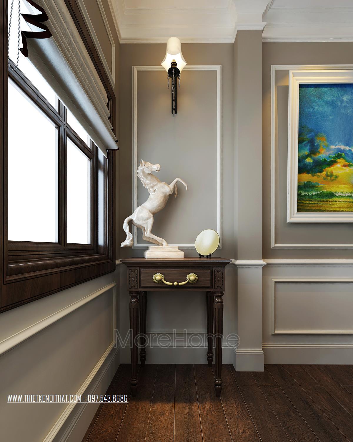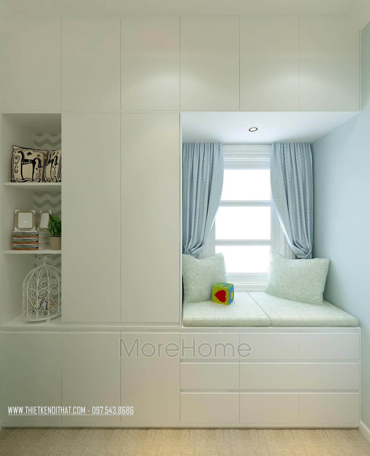 Thiết kế nội thất phòng ngủ khá đơn giản với tone màu trắng chủ đạo. Họa tiết trang trí đơn giản mang cảm hứng tân cổ điển tạo sự cân bằng về màu sắc và đường nét cho căn phòng. Điều đặc biệt trong căn phòng này chính là thiết kế kệ tủ âm tường, tuy căn phòng không quá rộng nhưng với các thiết kế đa năng và tủ âm tường, kết hợp với ánh sáng tự nhiên mà nó trở nên mở hơn rất nhiều,