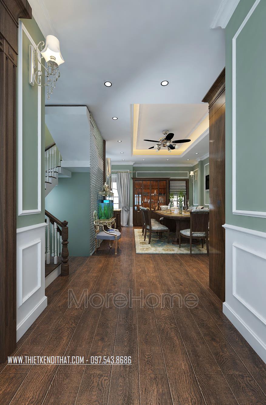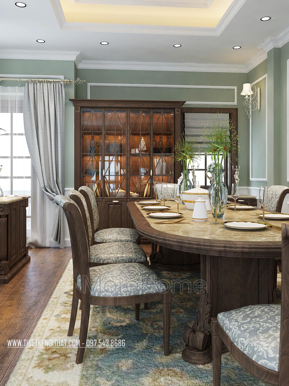 Thiết kế nội thất khu bếp phong cách tân cổ điển sử dụng gỗ tự nhiên tone màu veneer nâu trầm được sắp xếp gọn gàng, khoa học không tốn quá nhiều diện tích mà vẫn phát huy được tính năng vốn có. Hệ thống tủ gỗ kéo dài ở không gian bếp và bàn ăn giúp tăng tính công năng cho căn phòng, không chỉ vậy còn là một không gian trang trí ấn tượng, tạo điểm nhấn cho căn phòng.
