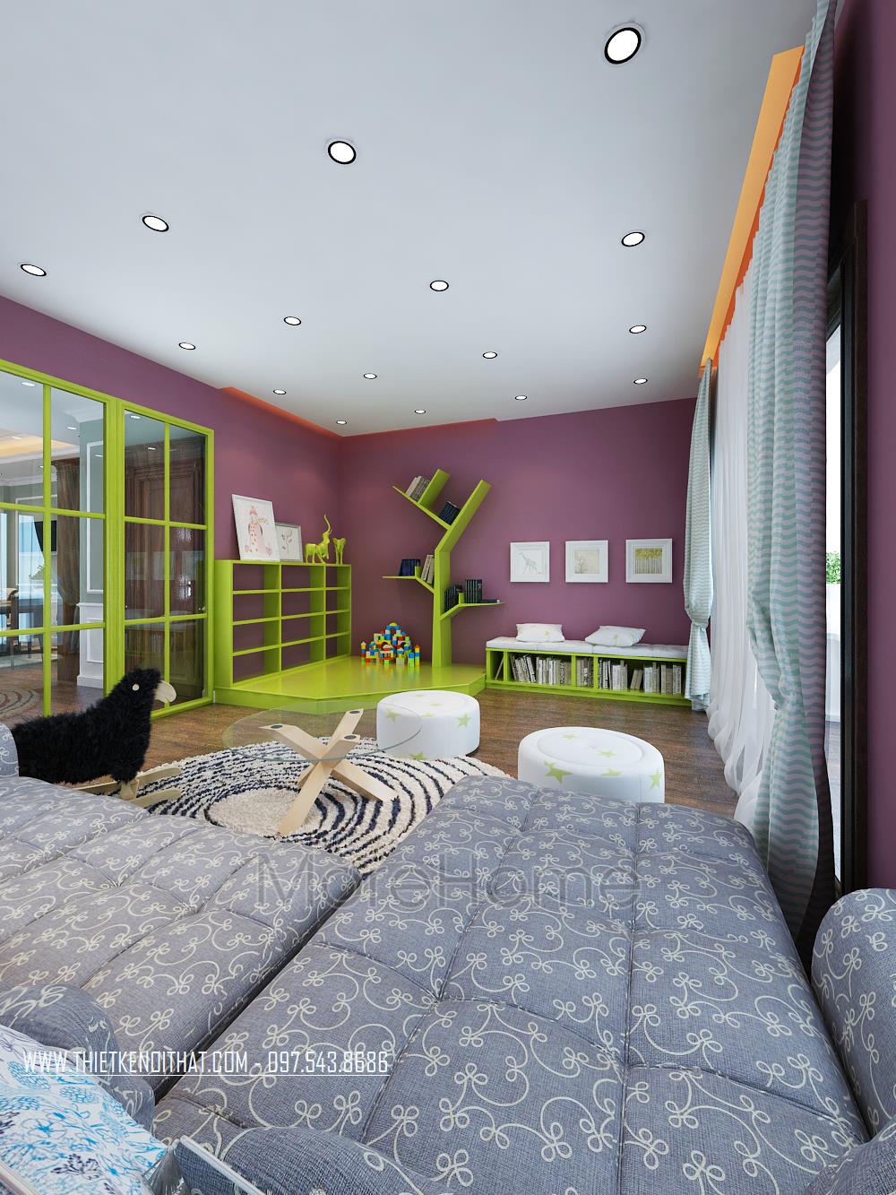 Một trong những không gian sum họp được ưa thích trong căn nhà chính là thiết kế khu sinh hoạt chung riêng biệt cho các thành viên trong gia đình. Được thiết kế riêng biệt dành riêng cho các hoạt động vui chơi, giải trí của cả gia đình, đây thực sự là nơi lý tưởng để nghỉ ngơi và thư giãn. Thiết kế sắc màu xanh, tím dường như phá vỡ quy luật tự nhiên của thiết kế tân cổ điển mà thay vào đó là sự hiện đại, năng động và trẻ trung.