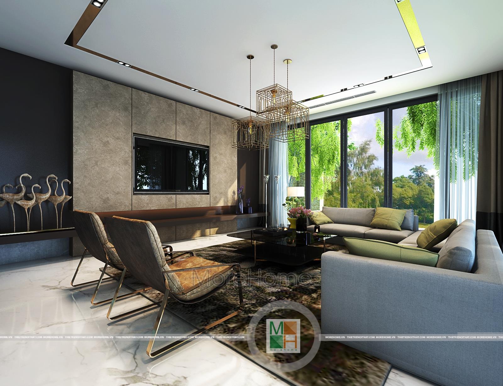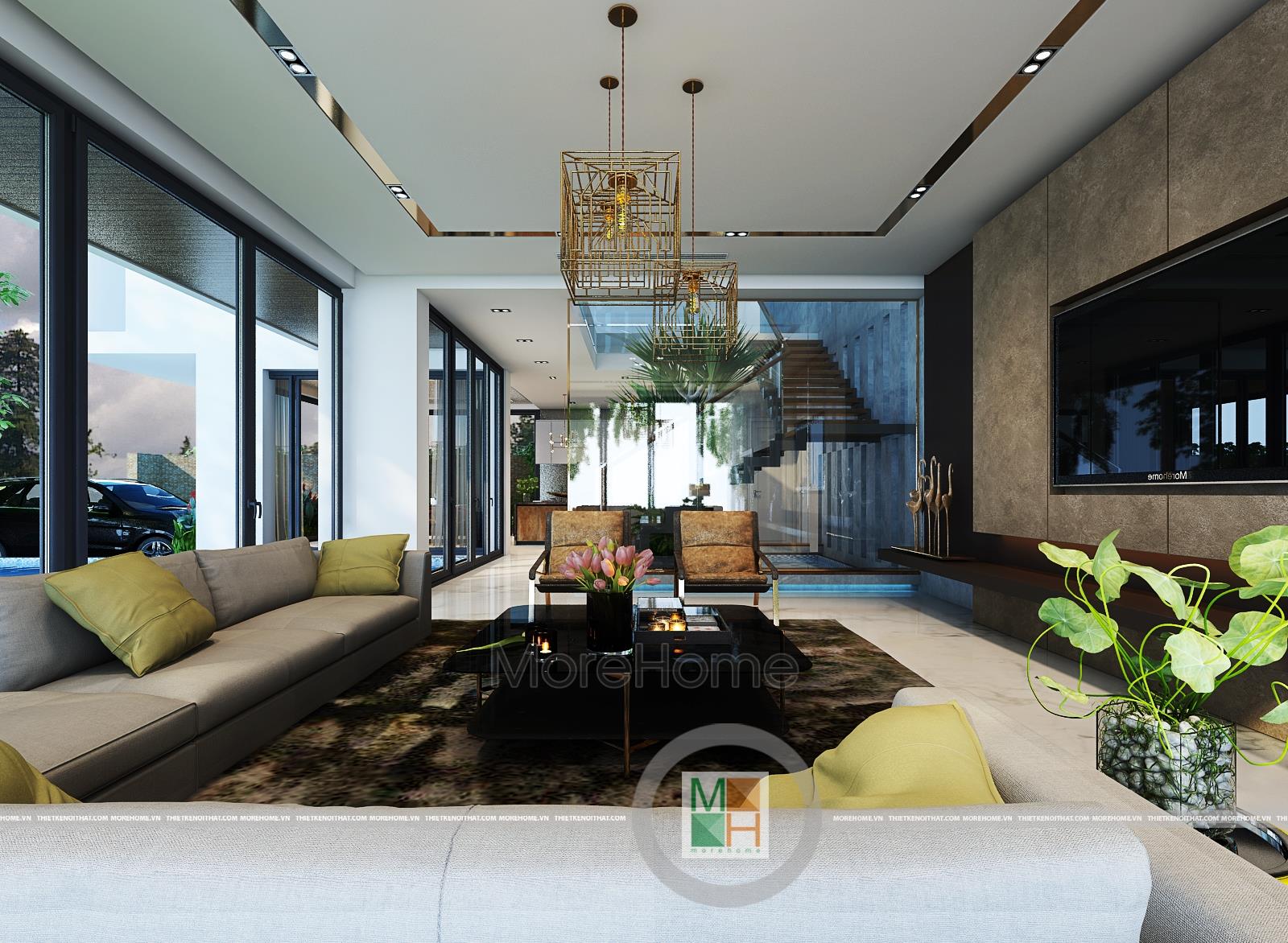 Khoảng sàn ngoài hiên được làm từ gỗ khối tự nhiên cao cấp. khối gỗ dày tạo cảm giác vô cùng chắc chắn. Từ bậc thềm tam cấp đưa bạn vào không gian phòng khách hiện đại dưới tầng 1, bộ sofa chữ L được kê sát vách kính góc còn lại là 2 chiếc ghế thư giàn bọc da. Đèn trang trí được thiết kế theo cấu trúc đèn lồng khá độc đáo mang trên mình phong cách truyền thống nhưng lại được nhấn nhá với màu sắc của phong cách hiện đại cùng tông màu với ghế thư giãn. Tất cả được bố trí hài hòa tạo nên một tổng thể hoàn thiện.