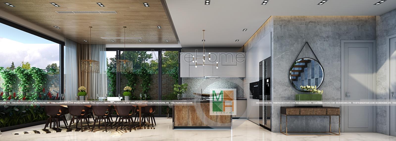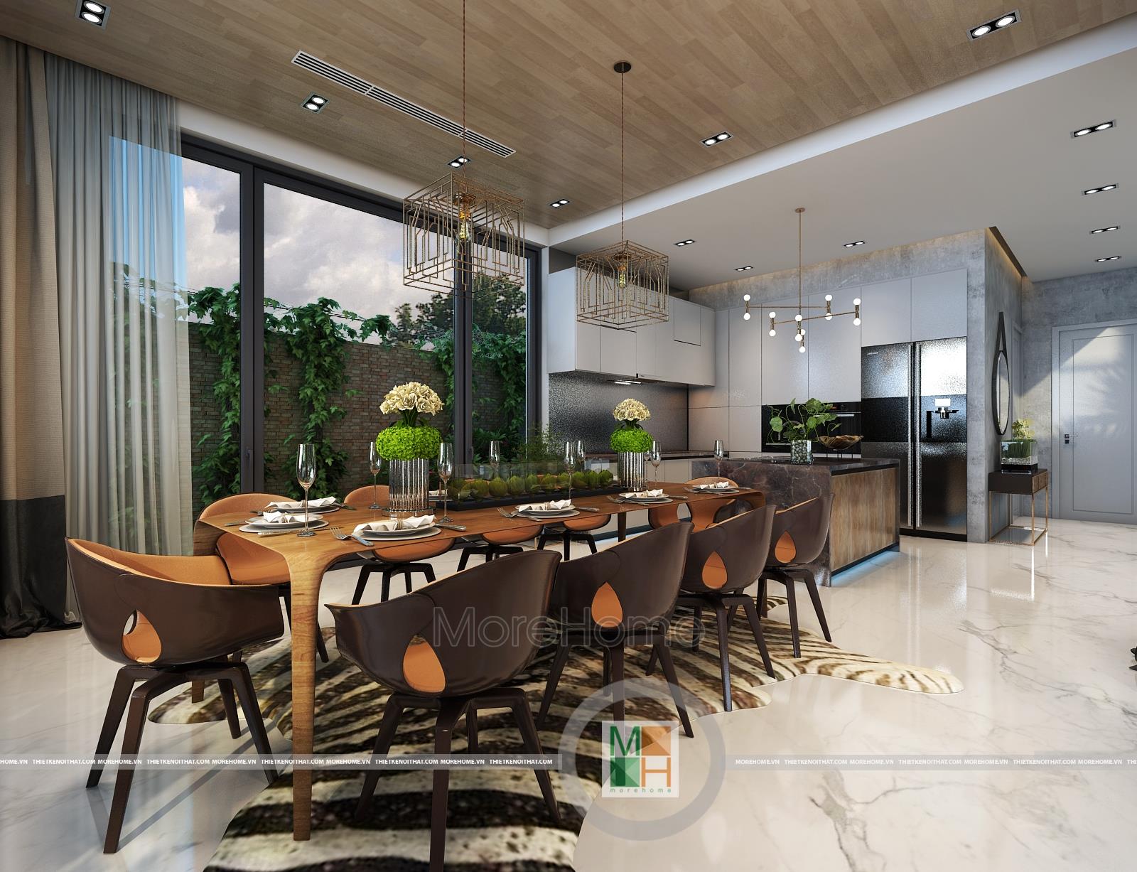 Phân tách giữa phòng khách với các không gian khác là vách kính cường lực trong suốt nhưng vẫn có được sự liền mạch. Sau vách kính là cầu thang lên tầng 2. Với không gian rộng nên dưới chân cầu thang còn được bố trí thêm tiểu cảnh với cây xanh và một bồn nước nhỏ điều hòa không khí cho phòng ăn và phòng bếp bên cạnh. Phòng ăn và phòng bếp được thiết kế trong cùng một không gian nội thất. Các kiến trúc sư đã khéo léo sắp đặt thành một không gian riêng biệt tạo thành góc L với cấu trúc chung của căn biệt thự. Bàn ăn lớn dành cho 10 người rất phù hợp với những buổi tiệc tùng liên hoan hay những bữa cơm sum họp gia đình ấm cúng. Phòng ăn với 3 vách kính thông thoáng nên có thể tận dụng tối đa được ánh sáng tự nhiên và không dùng nhiều tới hệ thống chiếu sáng chung trong nhà. Điểm khác biệt của không gian này là không sử dụng trần thạch cao mà sử dụng trần gỗ tạo điểm nhấn rất riêng.