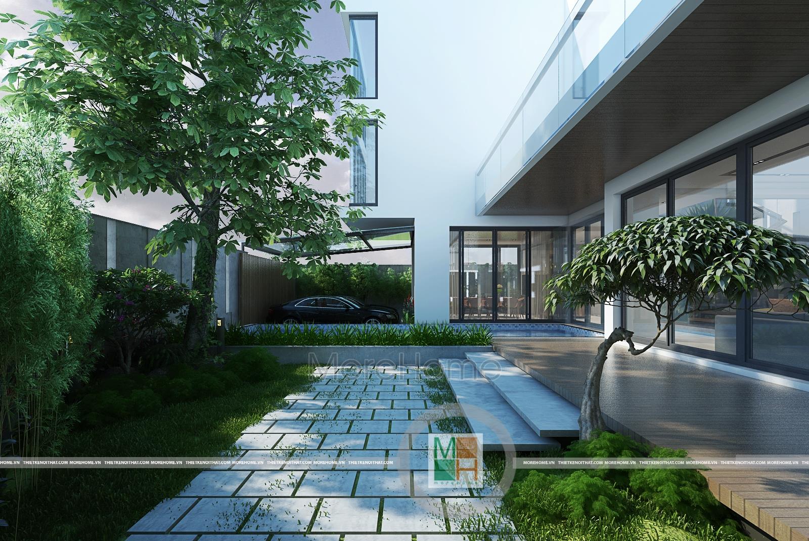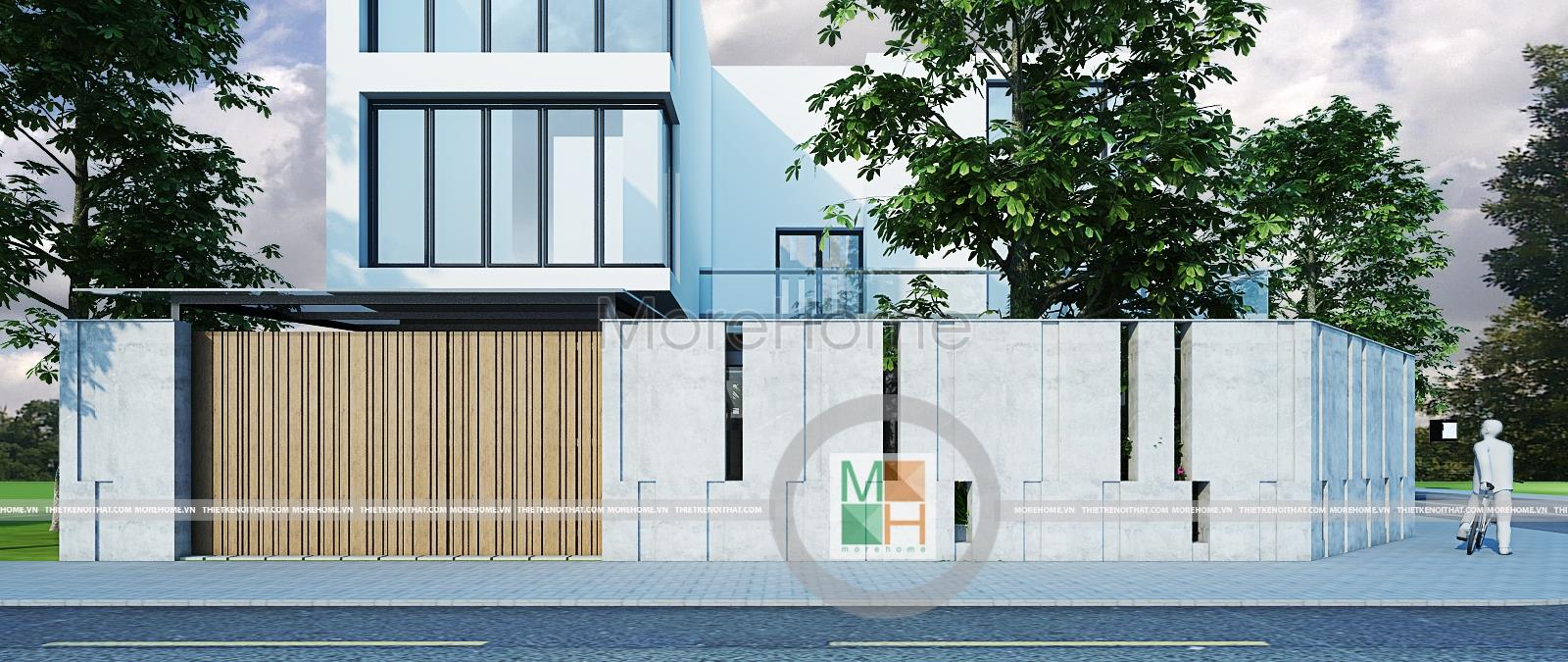 Căn biệt thự nhà anh Phúc tại Nghệ An được thiết kế như một căn biệt thự phố 3 tầng hiện đại không gian sân vườn khá rộng có chỗ để ô tô và bố trí các tiểu cảnh trang trí xung quanh. Căn biệt thự phố 2 mặt tiền nên được thiết kế 2 cổng tại 2 mặt tiền, một cổng cho xe ô tô vào gara và một mặt khác là cổng ra vào chính