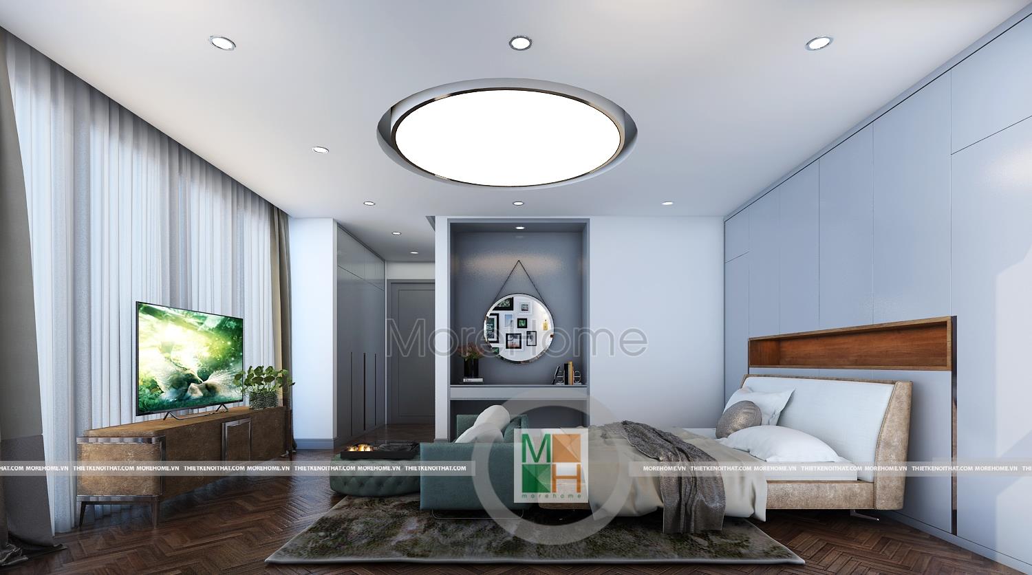Căn phòng đầu tiên nhiều tiện nghi nhất với thiết kế độc đáo. Diện tích căn phòng khá rộng nên kiến trúc sư có tư vấn kê thêm một bộ sofa đơn giản màu ngọc lam đậm. Bạn cũng có thể dùng căn phòng này để tiếp khách trong trường hợp khẩn cấp. Hệ thống tủ đồ và tủ trang trí đa số được thiết kế âm tường nên căn phòng có được độ phẳng nhất định. Trong căn phòng ngủ này còn sử dụng đèn mâm âm trần lớn thay thế cho tất cả những thiết bị chiếu sáng thông thường khác.