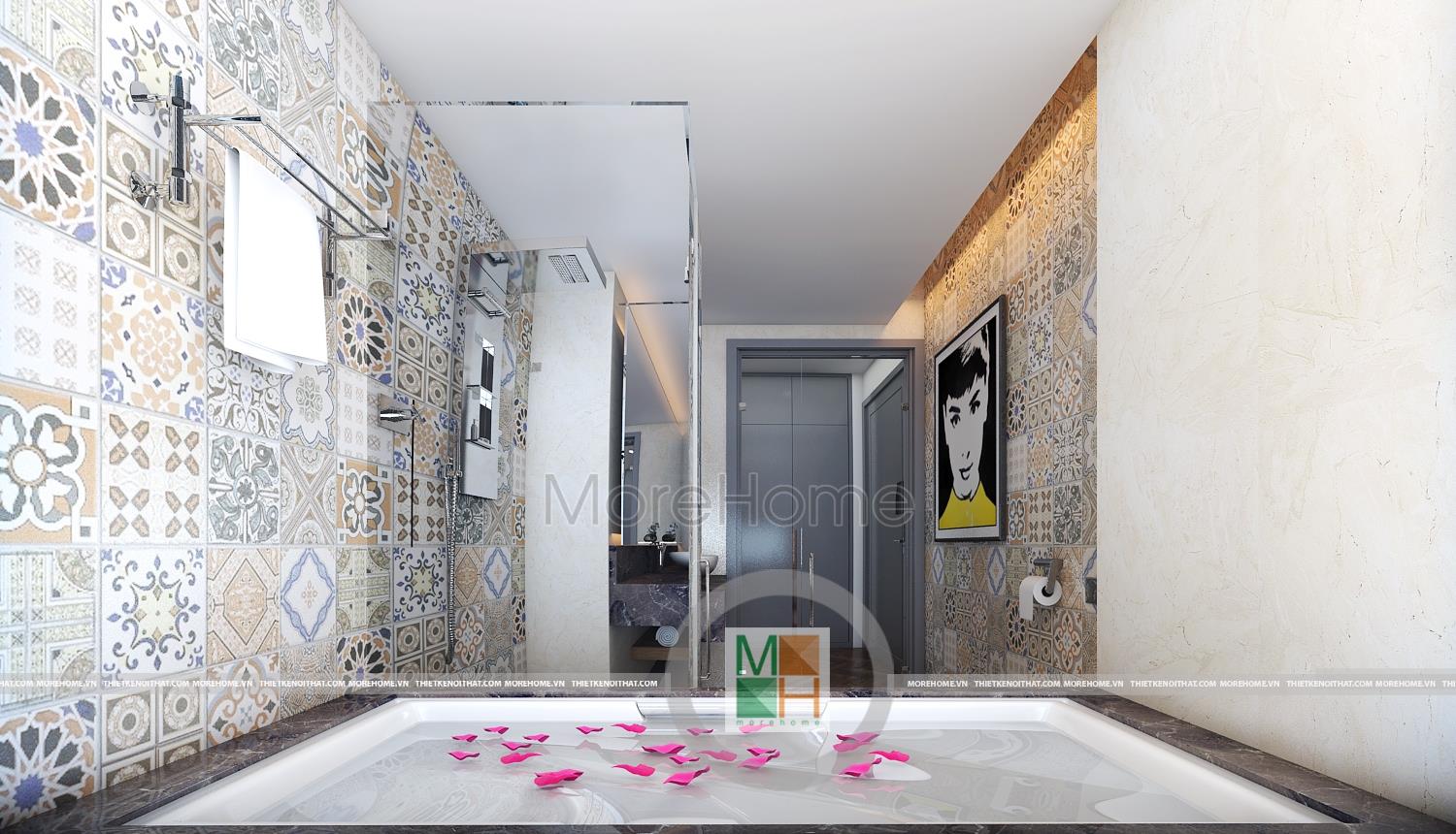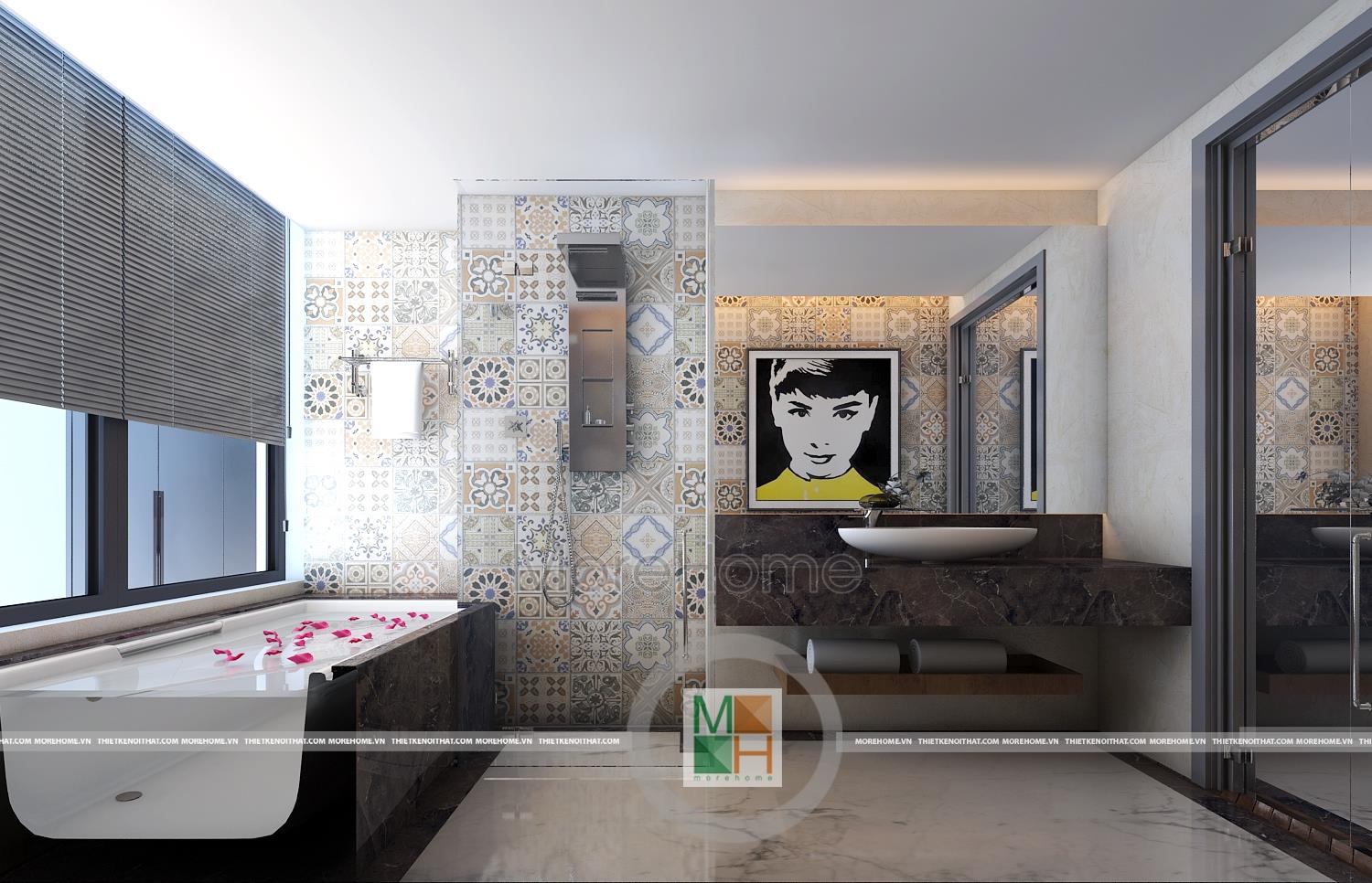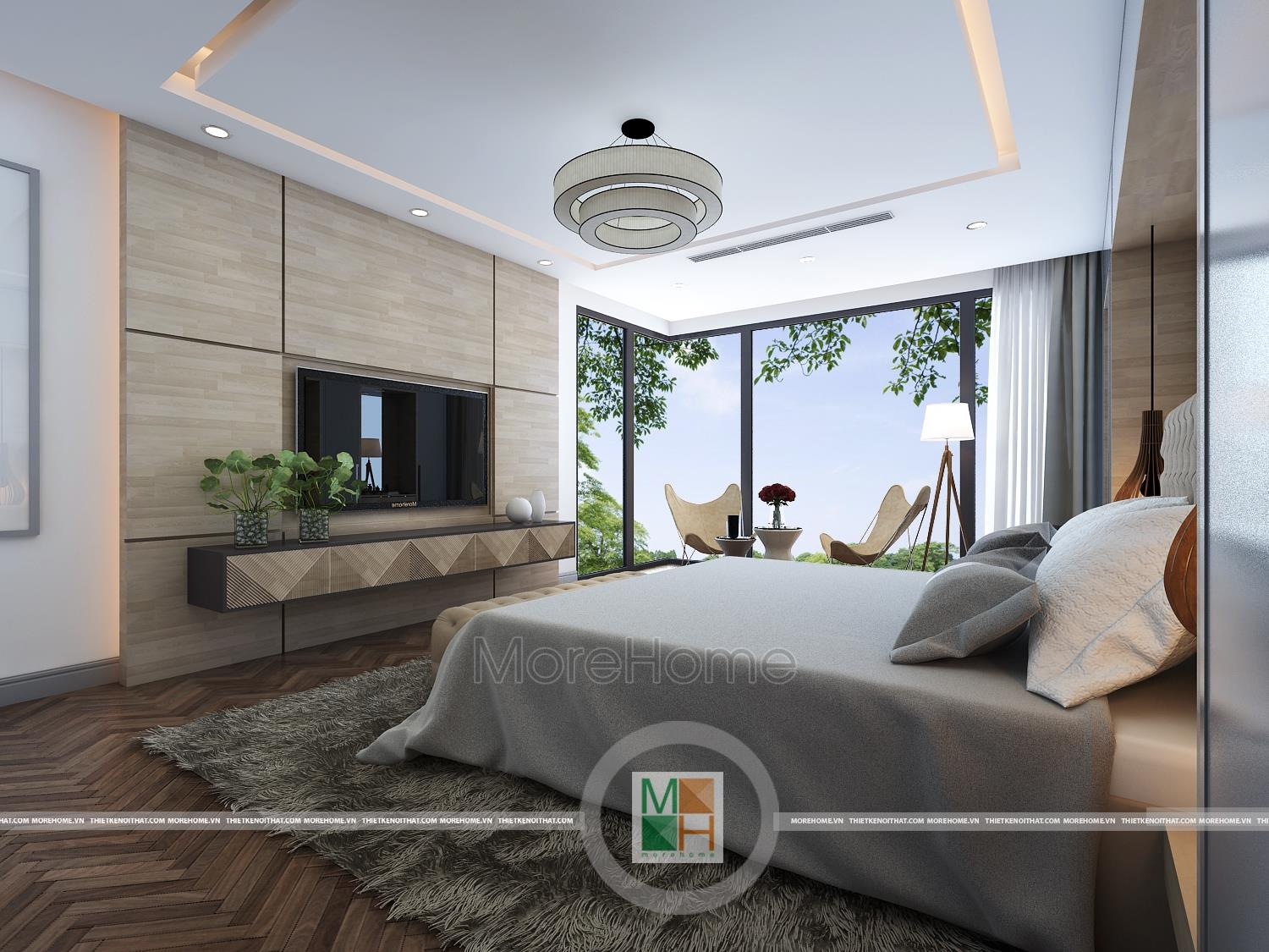 Tiếp đến là phòng ngủ số 2 được thiết kế theo phong cách hiện đại Tây Âu, với sự phóng khoáng về không gian và ý tưởng nhưng lại ấm áp trong nghệ thuật sắp đặt và phối cảnh mang lại cho bạn một không gian nghỉ ngơi thư giãn tuyệt vời. Phòng tắm được thiết kế song song với giường ngủ hướng ra ngoài cửa kính lớn. Tại đây view rất đẹp với bộ bàn trà thư giãn hình chóp úp vào nhau rất độc đáo, hệ thống tủ cũng được thiết kế âm tường, táp đầu giường lùi vào sâu trong tường một chút nhưng vẫn đảm bảo sự hài hòa và cân đối. Trên đầu giường có treo đèn chùm với ánh sáng vàng ấm áp. Không giãn lãng mạn và hiện đại này rất phù hợp cho những cặp vợ chồng mới cưới.
