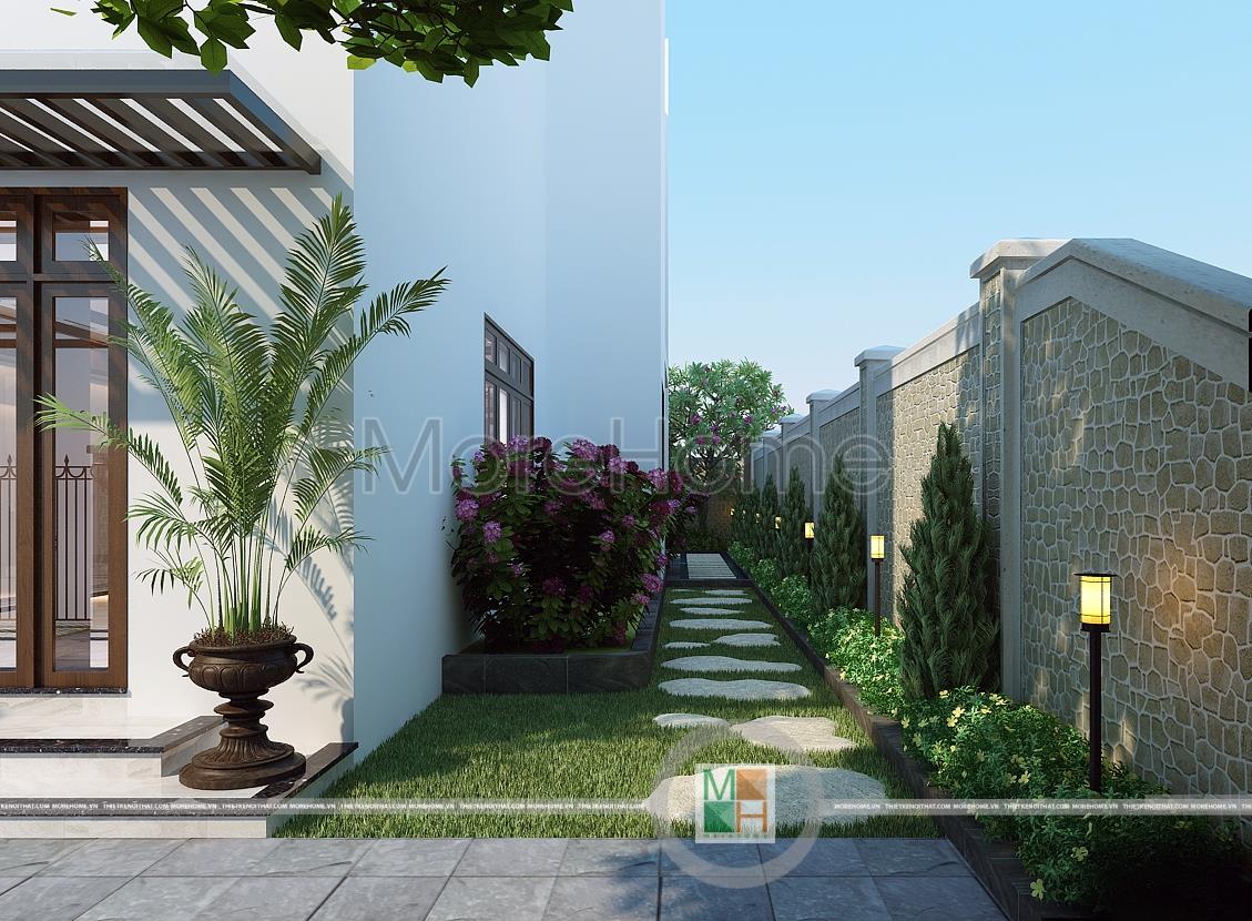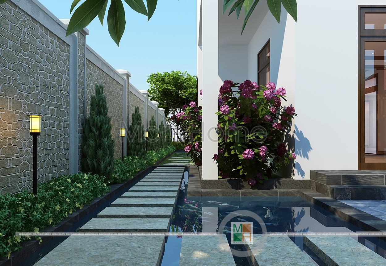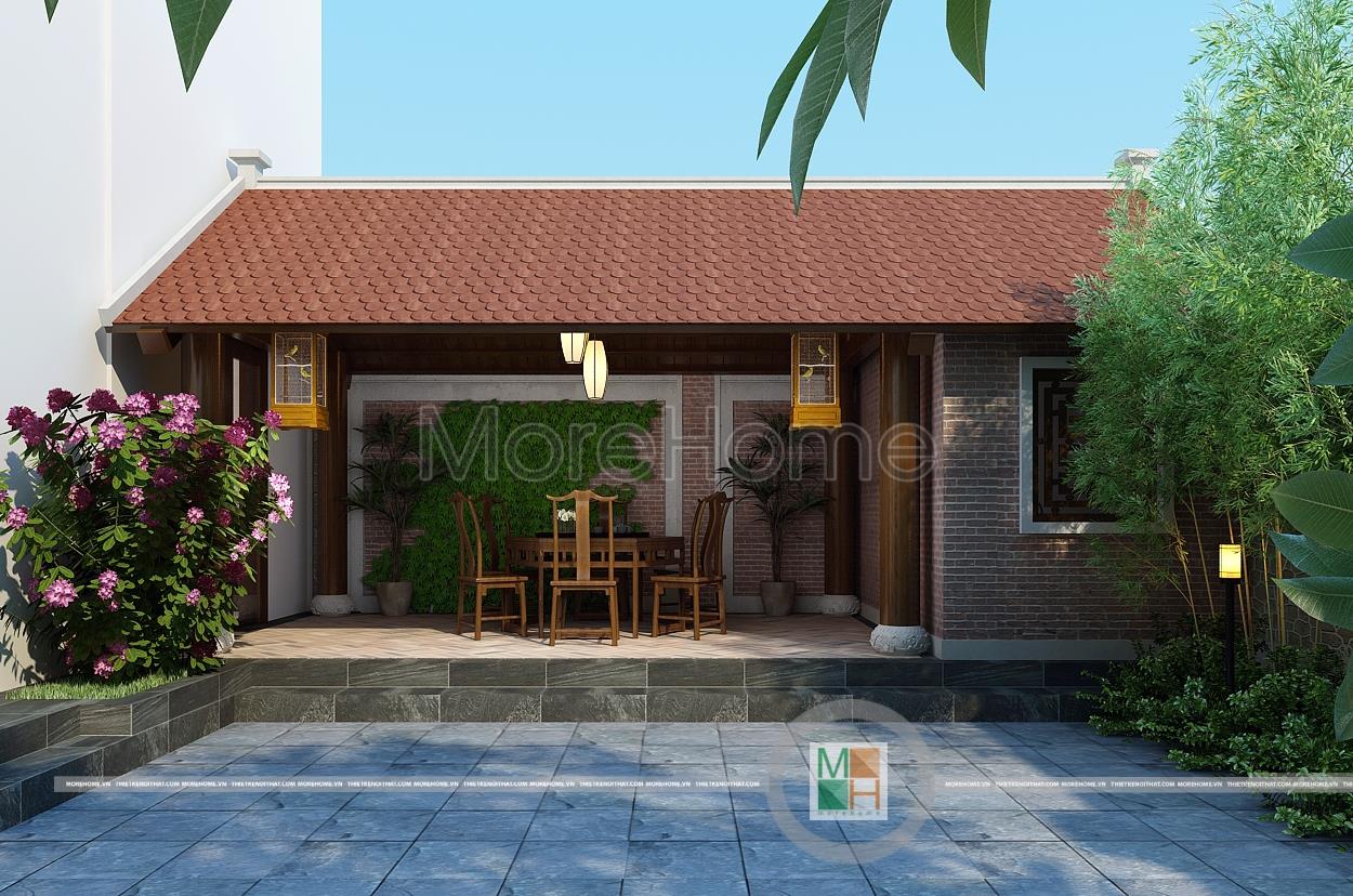 Không chỉ nội thất mà không gian ngoại thất của căn biệt thự này cũng khiến bạn không khỏi ngạc nhiên. Ngay bên cạnh phòng ăn là khu vực thư giãn ngoài trời với bộ bàn trà ấm cúng dưới mái hiên có dàn dây leo, cỏ cây hoa lá xanh mát.