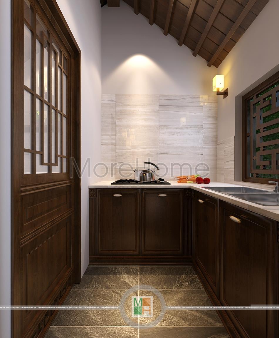 Không gian bếp chứ L với tủ bếp tân cổ điển, bàn bar bếp vừa là nơi chế biến đồ ăn và cũng là nơi trò chuyện của những bà nội trợ. Điểm nhấn trong không gian này là vách cnc ốp vào bàn bếp.