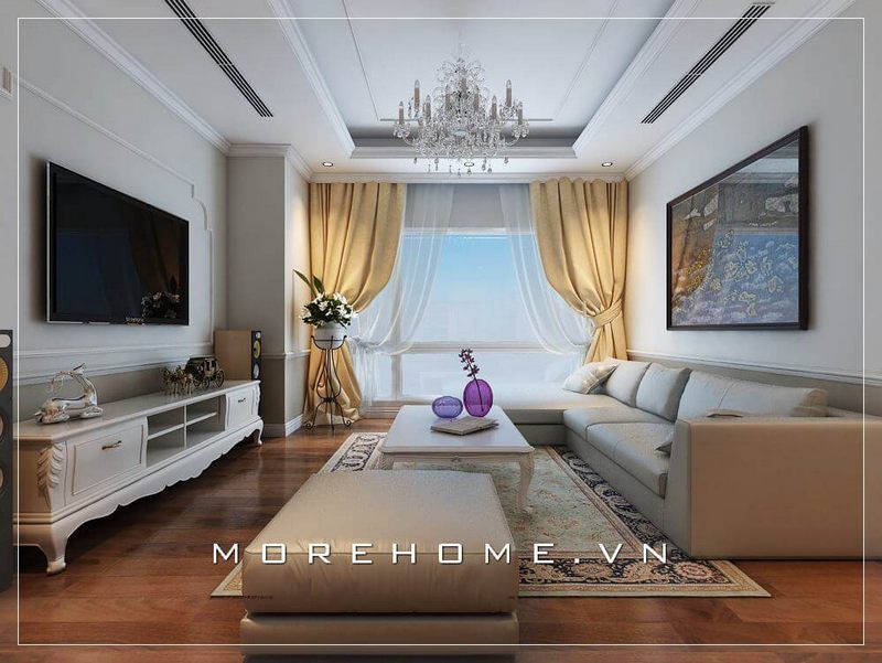 Trang trí nội thất phòng khách chung cư đẹp phong cách tân cổ điển với tone màu trắng được sử dụng tạo điểm nhấn cho các đường nét trạm khắc tinh xảo và khéo léo.