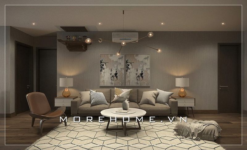 Vị trí trung tâm của phòng khách căn hộ hiện đại được đặt 1 chiếc ghế sofa màu nâu vàng cộng với chiếc bàn bé nhỏ xinh xắn đầy phá cách. Ở dưới được đặt tấm thảm chải sàn màu xám rất phù hợp với bộ bàn ghế.