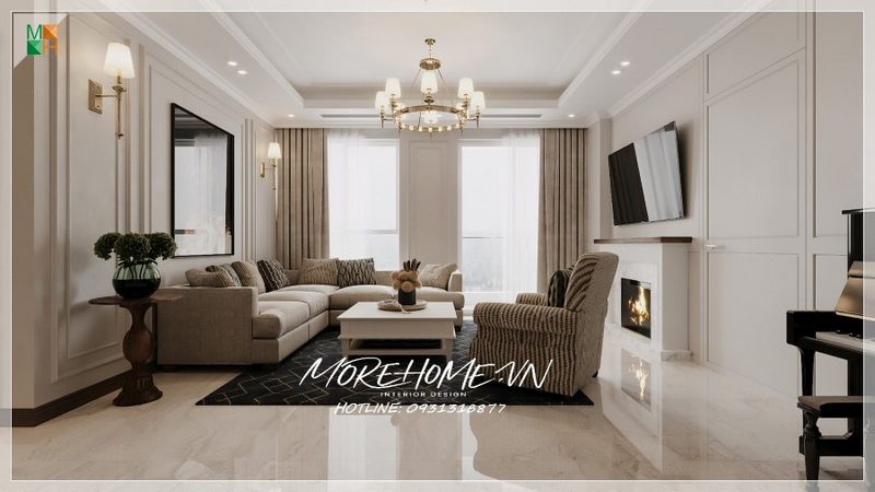 Nội thất phòng khách tân cổ điển sang trọng được bố trí hợp lý, tiện nghi đem lại một không gian chung cư, nhà phố cao cấp, ấn tượng.