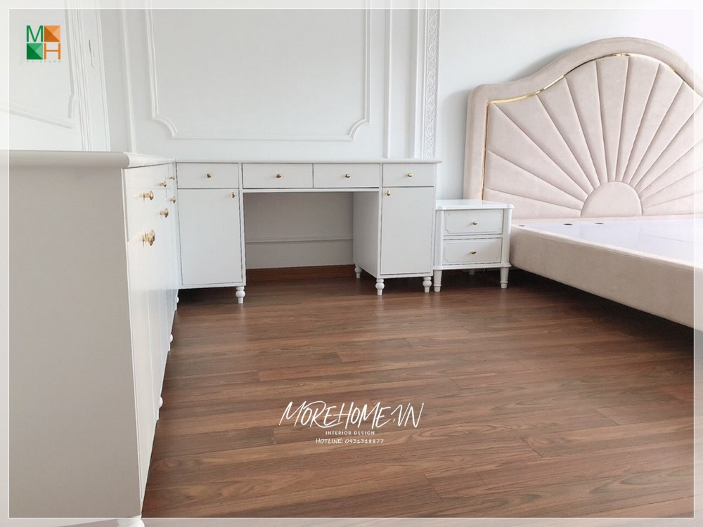 Thi công tab đầu giường gỗ tự nhiên màu trắng có chân tân cổ điển tô điểm trang trí thẩm mỹ cho không gian và sự tiện nghi